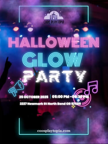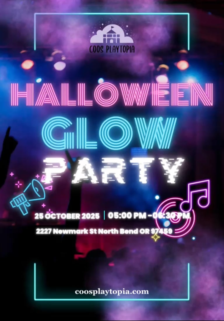 Get ready for the Halloween Glow Party at Coos Playtopia! Step into a glowing wonderland filled with playtime, character meet & greet, and spooktacular activities. Dress in your favorite costume and light up the night with family fun!